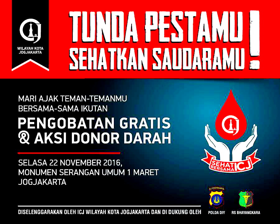 Jogja Konveksi dalam rangka peduli terhadap sosial turut dalam kegiatan Pengobatan Gratis dan Donor Kegiatan sosial ini dilaksanakan pada hari Selasa 22 November 2016, yang diselenggarakan olehICJ Wilayah Kota Yogyakarta yang didukung oleh Polda DIY dan RS Bhayangkara Yogyakarta